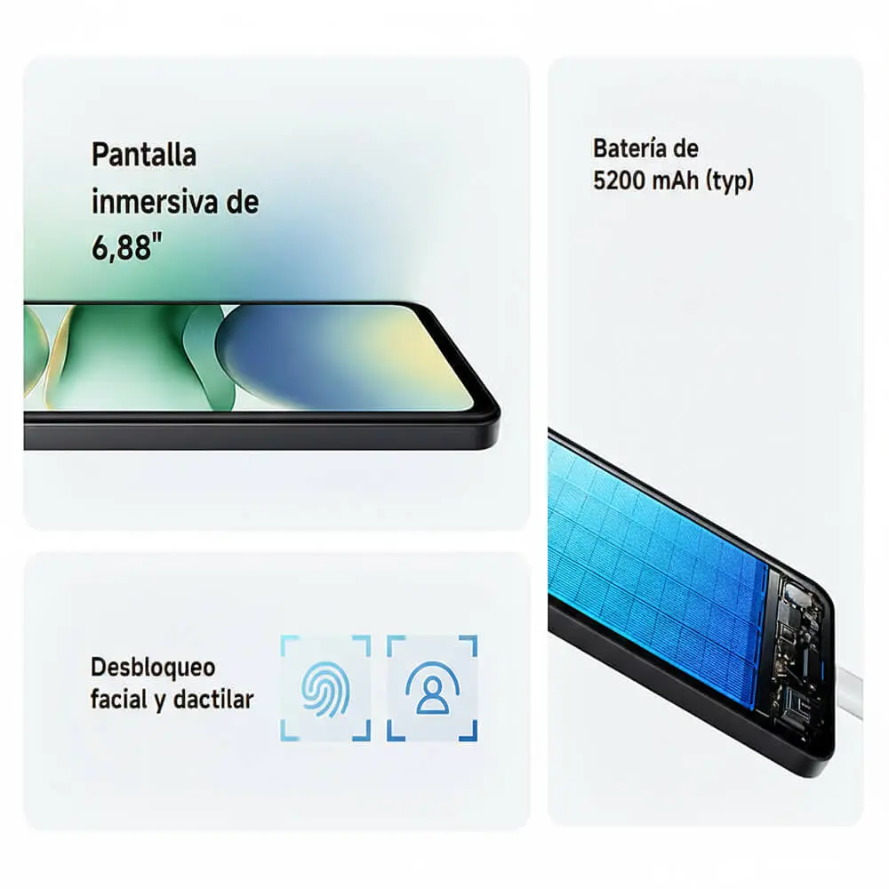 El Xiaomi Redmi A5 está diseñado para los usuarios que no quieren perderse ningún detalle. Su característica más llamativa es su pantalla de 6.88 pulgadas, una de las más grandes de su categoría, que convierte la navegación y el consumo de vídeo en una experiencia totalmente inmersiva. Su acabado en color negro le otorga un aspecto sobrio y profesional que encaja en cualquier situación.